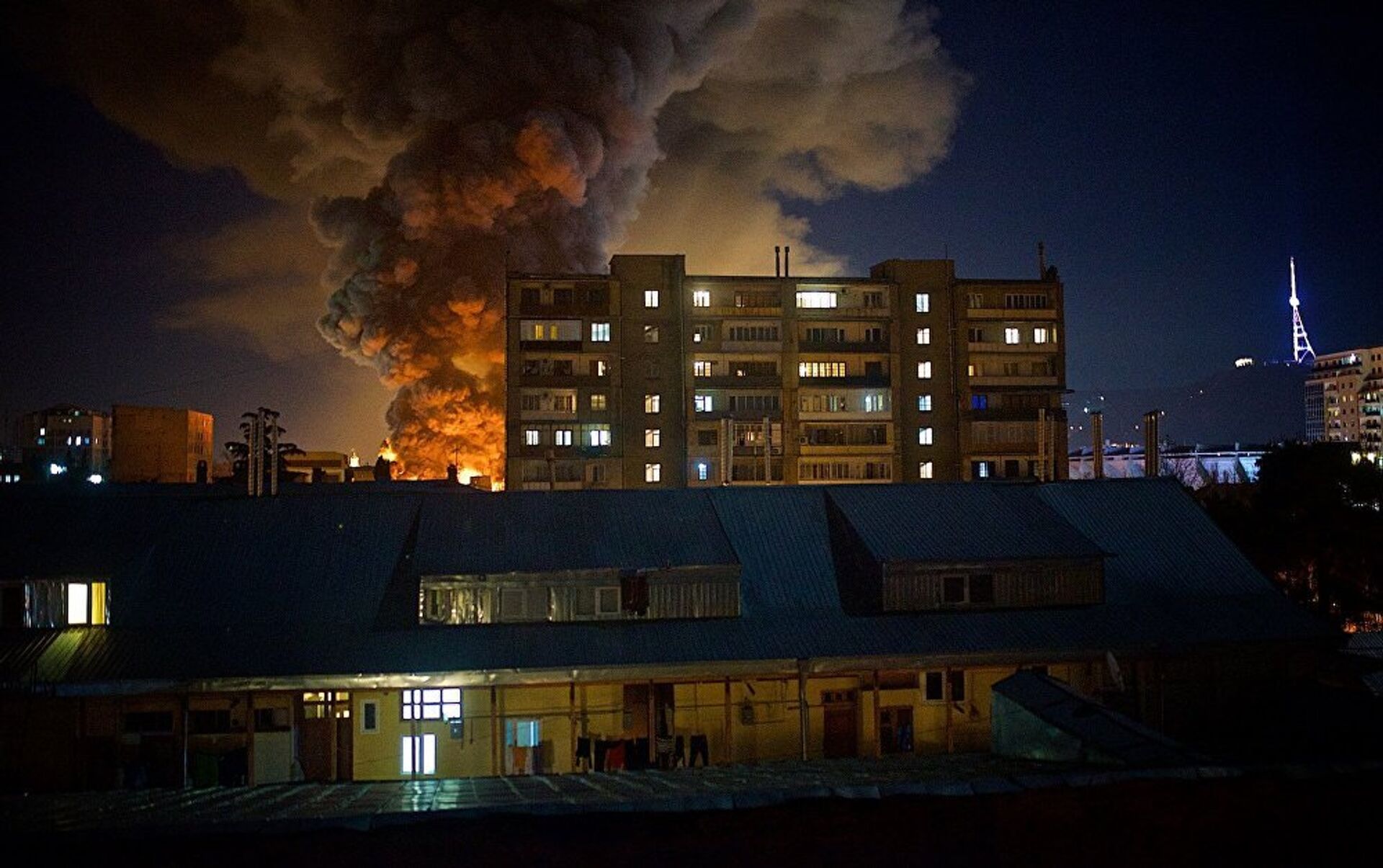 Пожар начался в 0:14 по тбилисскому времени, предположительно, на втором этаже трехэтажного здания. Сгорело около 3 тысяч квадратных метров. На ликвидацию пожара были брошены серьезные силы — 35 пожарных машин разного типа, около ста пожарных-спасателей, место ЧП было оцеплено полицией.