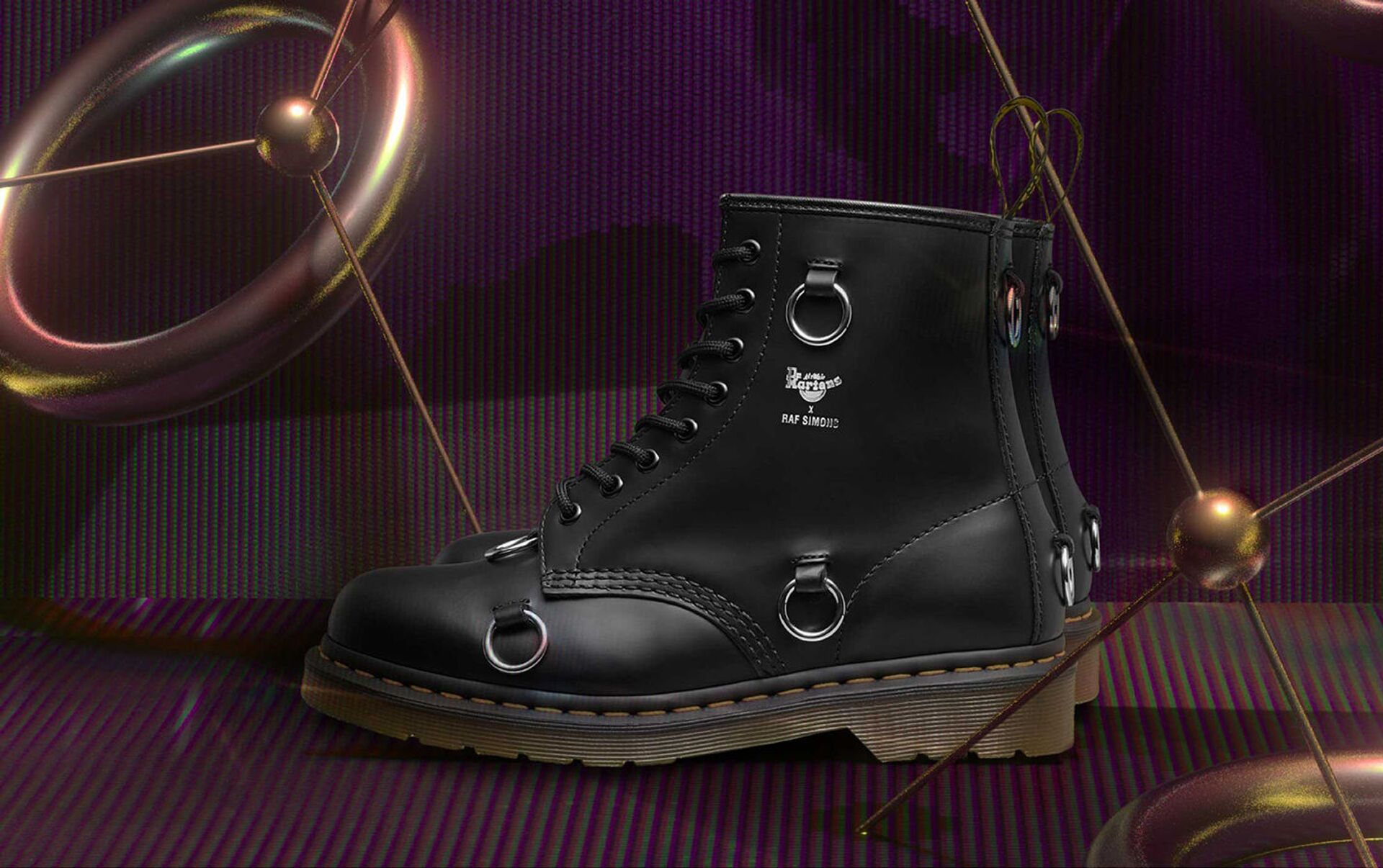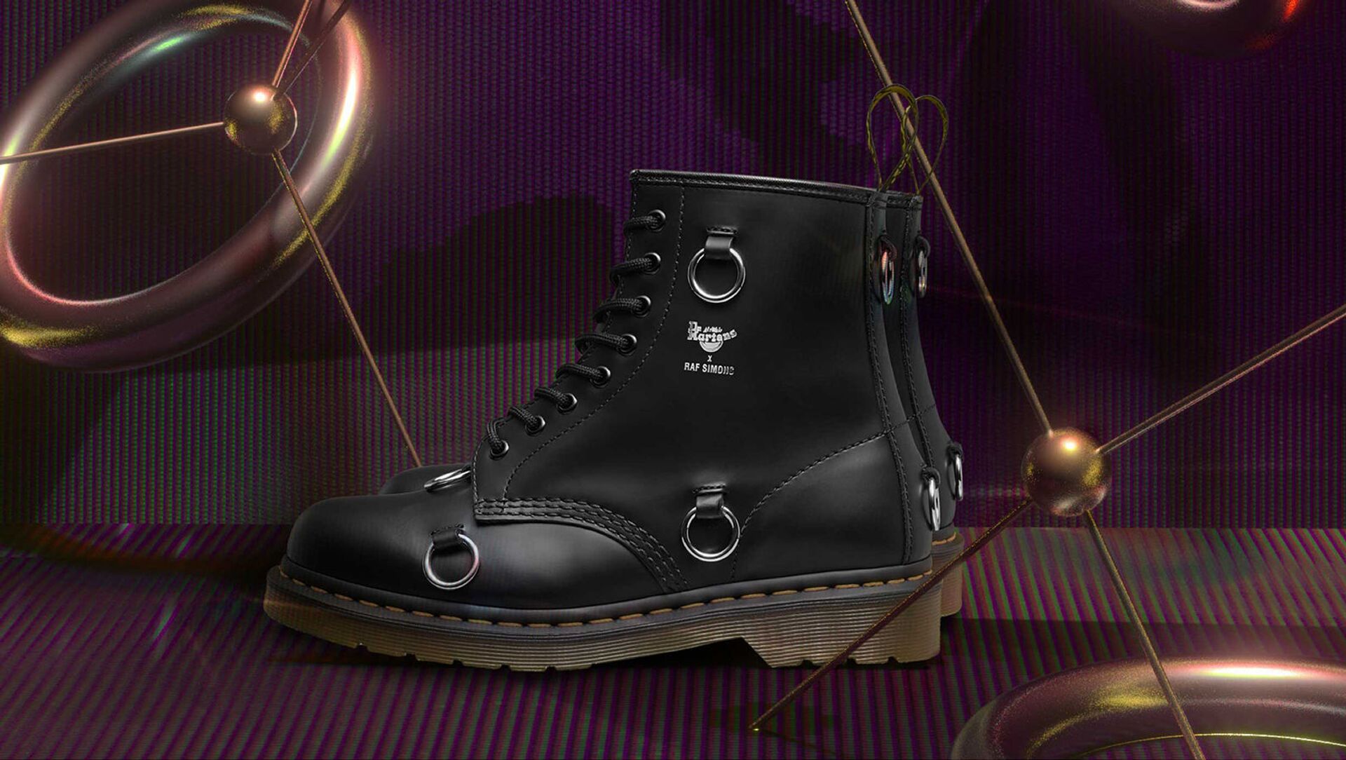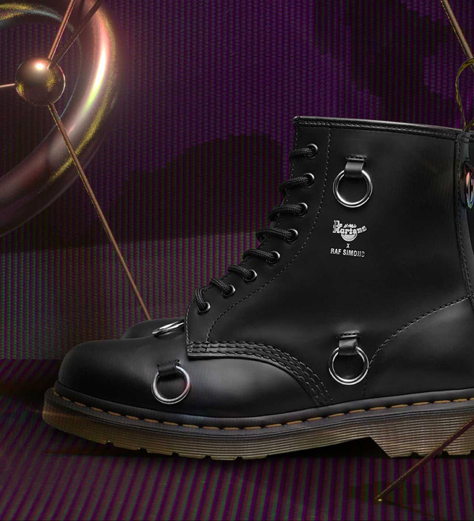 Симонс декорировал ботинки из гладкой кожи двойным логотипом и никелевыми кольцами, которые неоднократно появлялись в последних коллекциях бельгийского дизайнера, в том числе и в его коллаборациях с Eastpak и Fred Perry. По словам Рафа, его вдохновила клубная жизнь Лондона и времена, когда панк постепенно переходил в new wave. «Тогда люди меняли свой образ, разрезая одежду, добавляя булавки, колечки, брелоки. Новая версия ботинок 1460 побуждает их владельца к творчеству. На кольца можно навесить личные брелоки или же оставить ботинок таким, какой он есть», — объяснил дизайнер.
