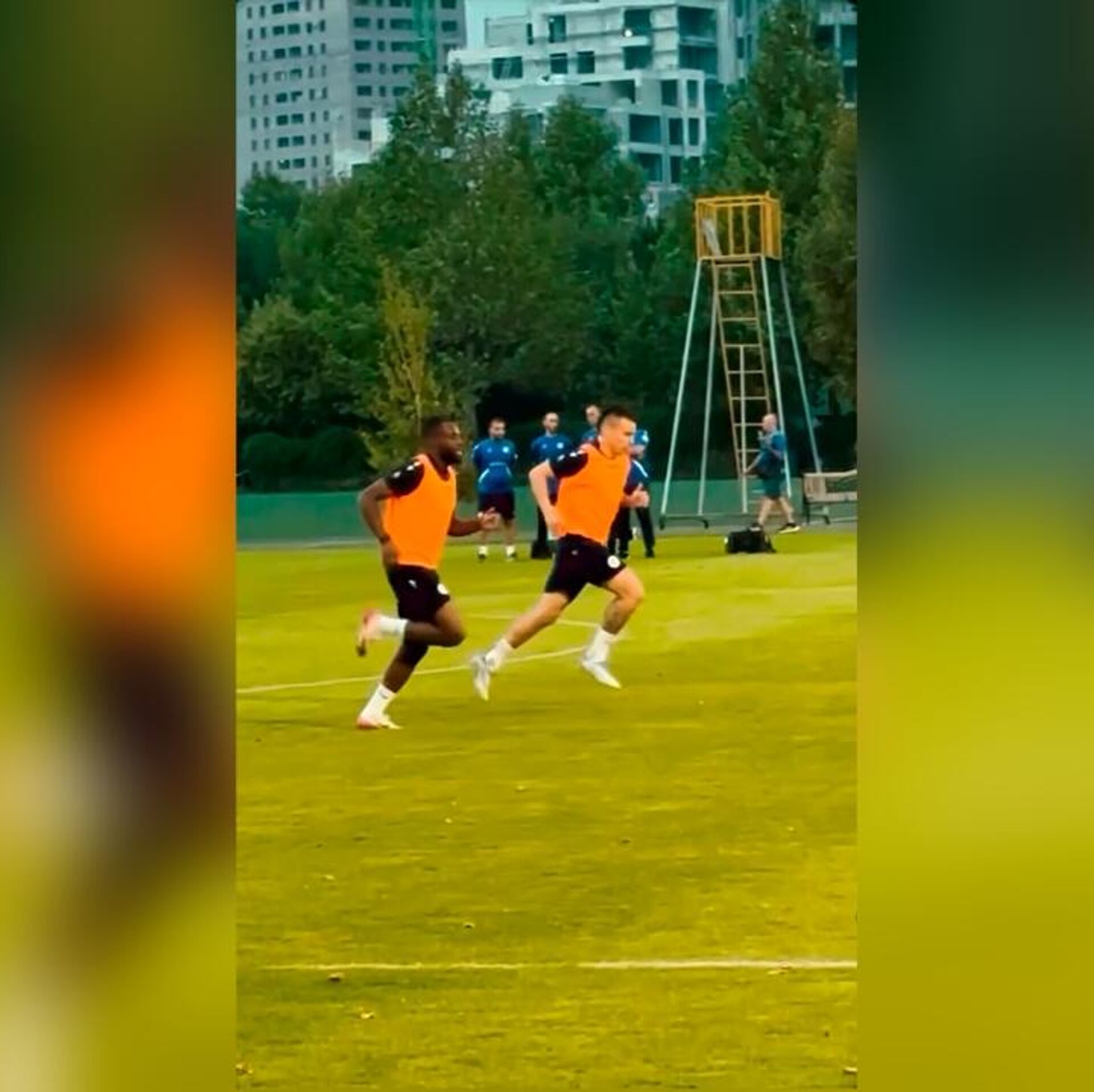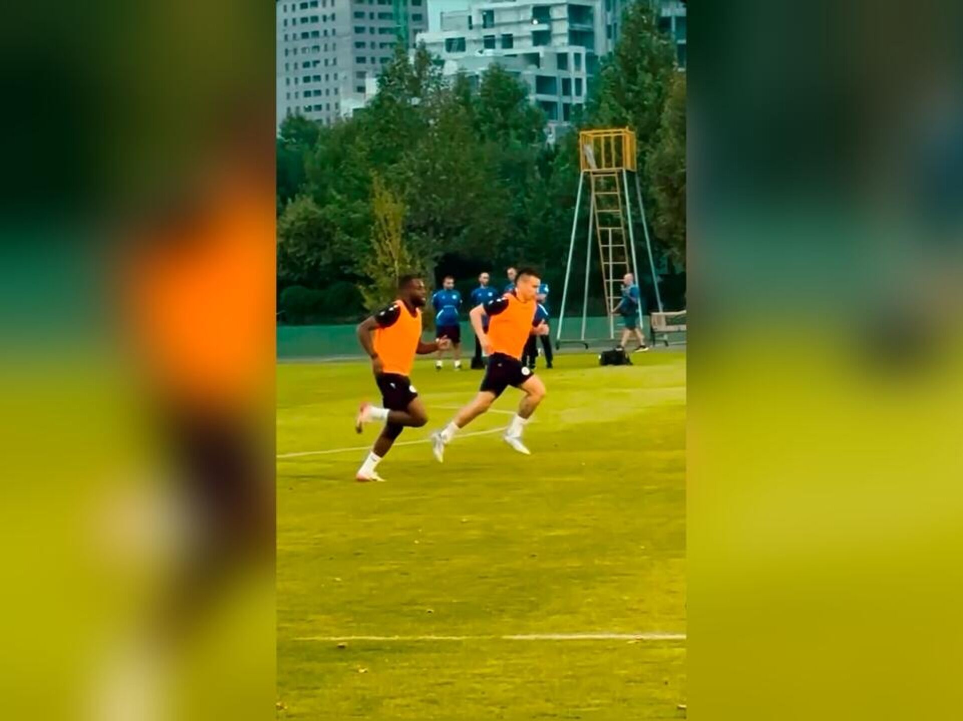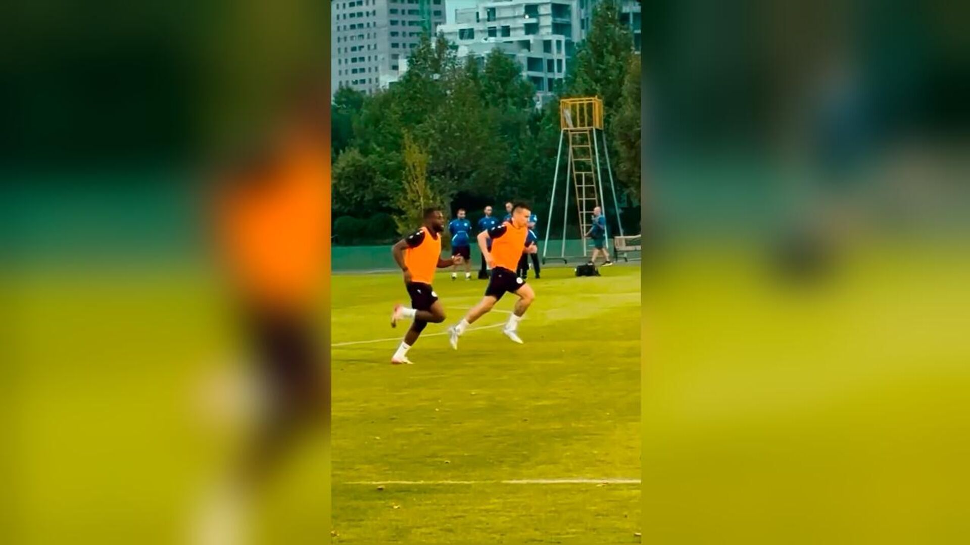 Футболисты выполняют базовые упражнения, а главный тренер команды Егише Меликян внимательно следит за действиями игроков и проводит мотивирующие беседы.