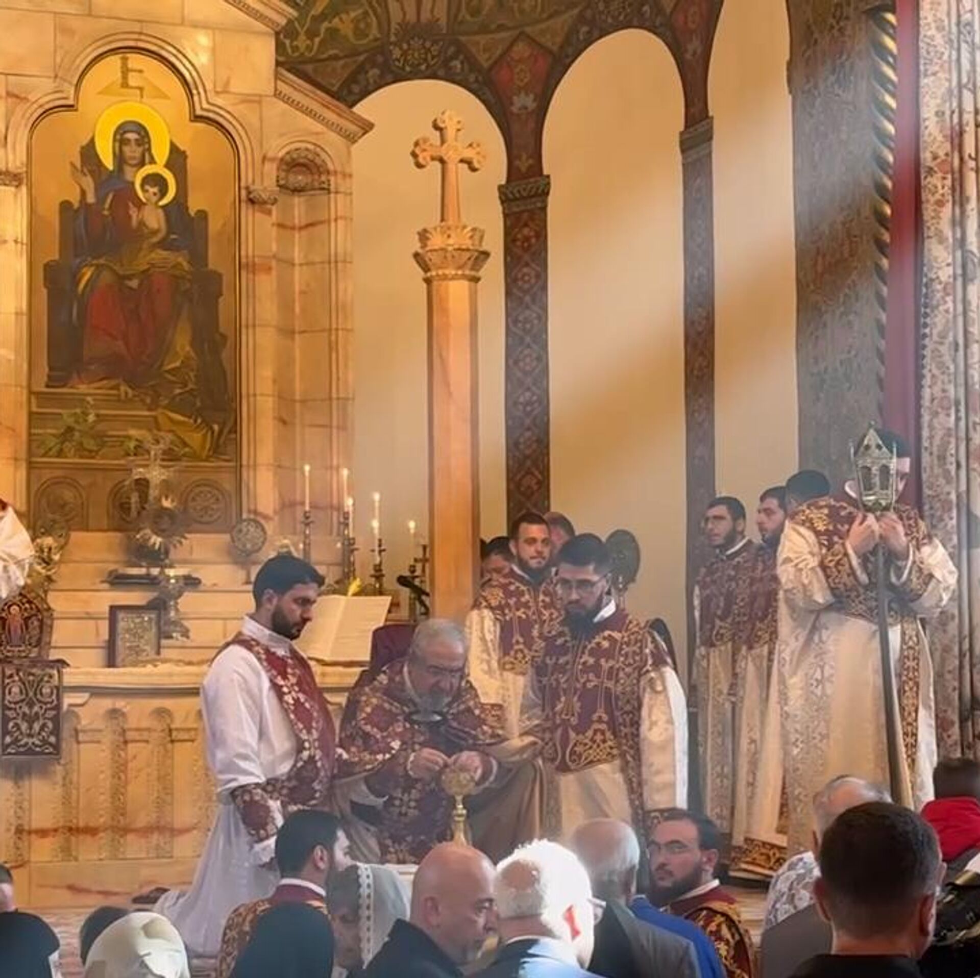ЕРЕВАН, 2 ноя - Sputnik. Священная литургия в Кафедральном соборе Эчмиадзина завершилась. Она была посвящена 26-й годовщине помазания и интронизации Католикоса Всех армян Гарегина II.На протяжении всей литургии в главном храме ААЦ был установлен Скеврский реликварий, чтобы все верующие могли поклониться святыне.Богослужение состоялось почти одновременно с "литургией" в монастыре Ованаванк, которую провел расстрига Степан Асатрян в присутствии премьера Никола Пашиняна и членов правящей силы.Противостояние между властями Армении и Армянской Апостольской Церковью обострилось после резких высказываний премьер-министра Никола Пашиняна, опубликованных в социальных сетях, где он подверг критике высшее духовенство. Позднее глава правительства предложил изменить порядок избрания Католикоса всех армян, предусматривая ключевую роль государства в этом процессе, и заявил о намерении лично возглавить движение по его смещению. Ситуация обострилась после того, как бывший священник Асатрян объявил о намерении провести воскресную службу в Ованаванке. В Эчмиадзине заявили, что Асатрян не имеет права совершать богослужения, а власти, поддерживая его действия, пытаются внести раскол в Армянскую Апостольскую Церковь.