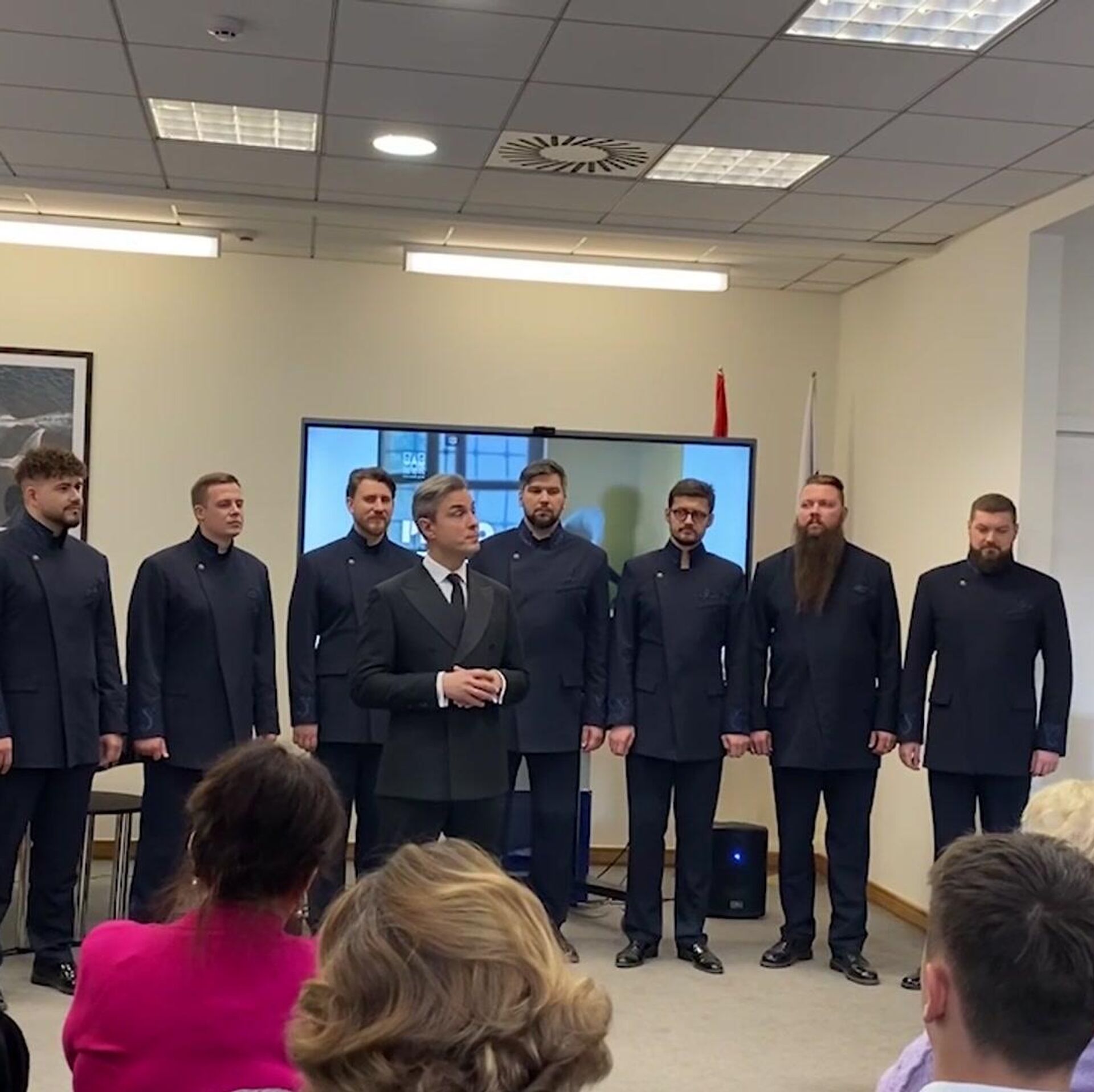 Прямо с порога солисты хора исполнили "Многая лета!", после чего уже в самом здании они спели несколько композиций на армянском и русском языках, среди которых были "Песня о Родине" прославленного Микаэла Таривердиева и "Ov, Hayots ashkhar" композитора Макара Екмаляна.